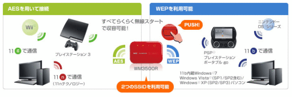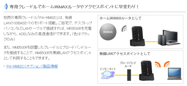 AtermWM3500Rという製品ですが、これ、非常に凄い技術が取り入れられているらしいです。高速通信(40M)や簡易なボタンや設定が可能なところが売りのようです。初めは家の光回線とクレードルを接続して、光回線+Wifiの利用(+端末の充電)ができるだけと思っていた。しかし、もっと多様な利用方法があった。