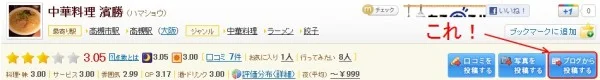 食べログにログイン後、お店のページにいくと右側に上図のようなボタンが現れます。ログインすると、口コミを投稿したり、写真を投稿することが可能になりますが、なんと、「ブログから投稿する」というボタンがあります。