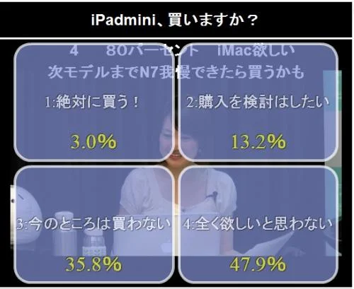 上図はリアルタイムにニコニコ動画でiPad miniの情報から評価し、iPad miniを購入するか、しないか?とアンケートとったものです。どうやら、僕と同じように「買わない」という考えを持ったユーザーが実に83.7%(今のところも含めて)もいるようですね。