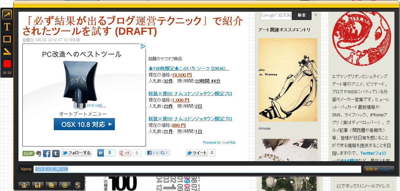 を使っていましたが、Jingのようにコメント記入とか出来ませんでした。よくキャプチャーに文字挿入など、わかりやすく説明を入れているブロガーさんが多いですが、これを使ってたのか!!上図のようにキャプチャーしたあとに、矢印や文字など挿入を簡単にできます。これはイイ」!!